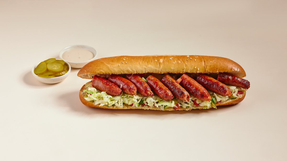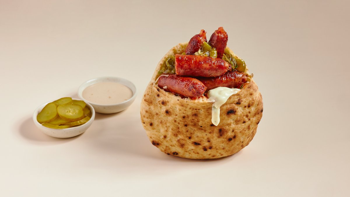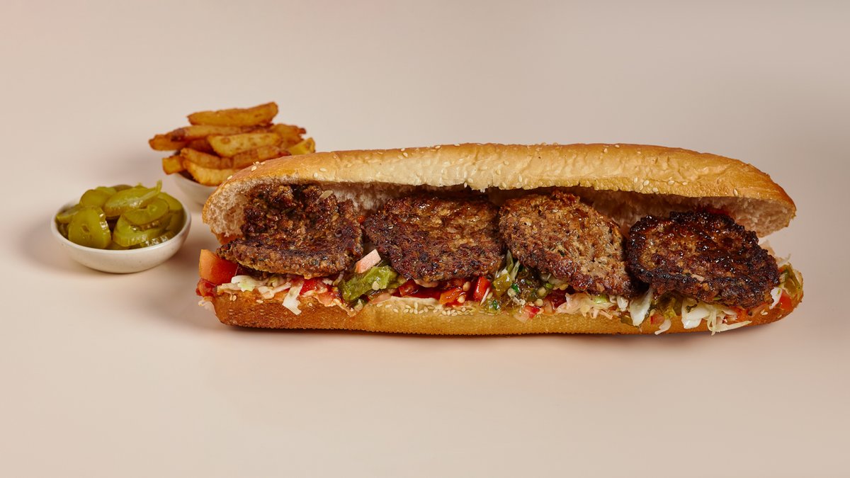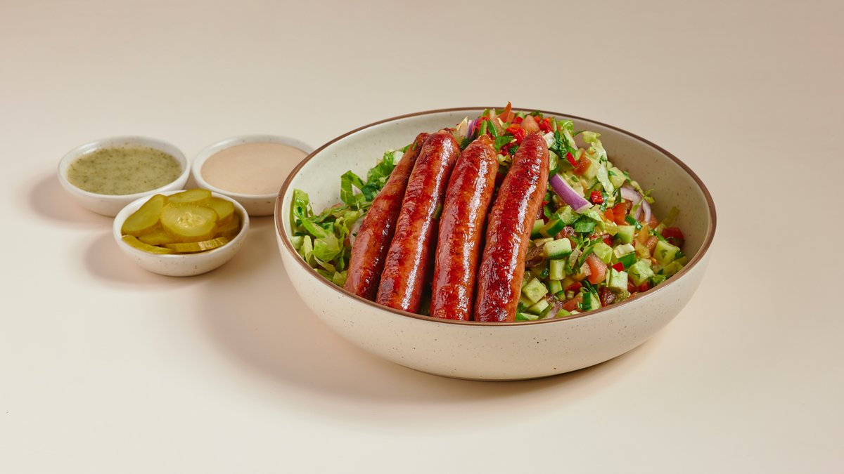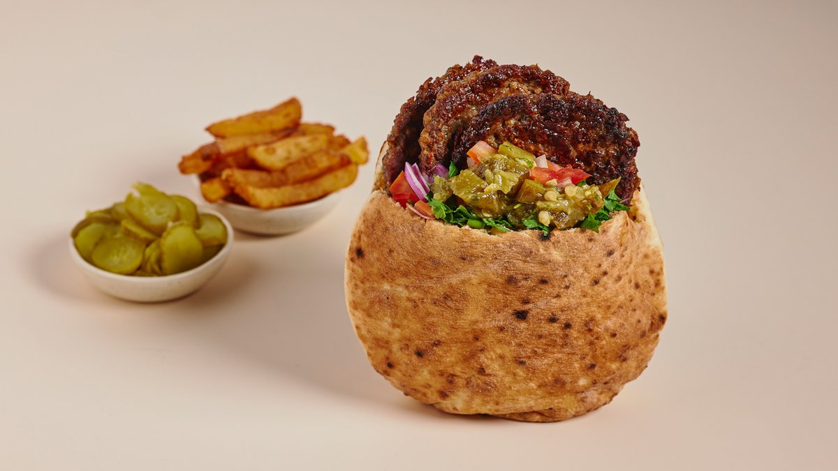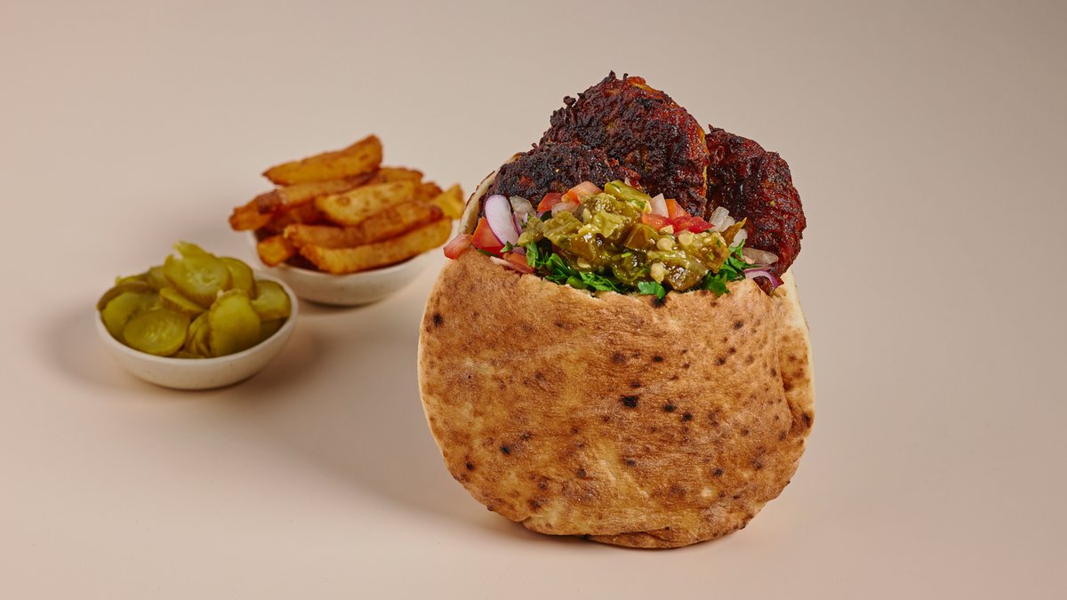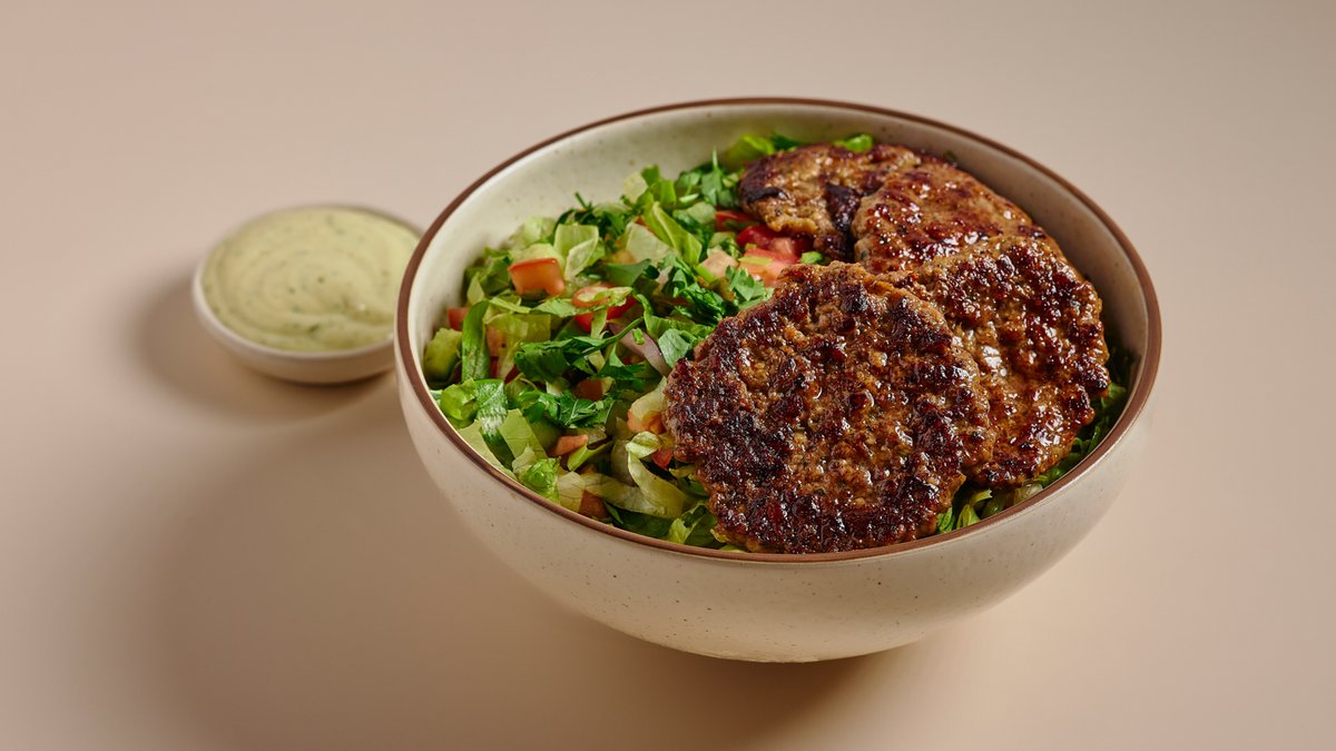 קבב, מלפפון, עגבניה, תערובת ירוקים, בצל סגול ומעט פלפל חריף
