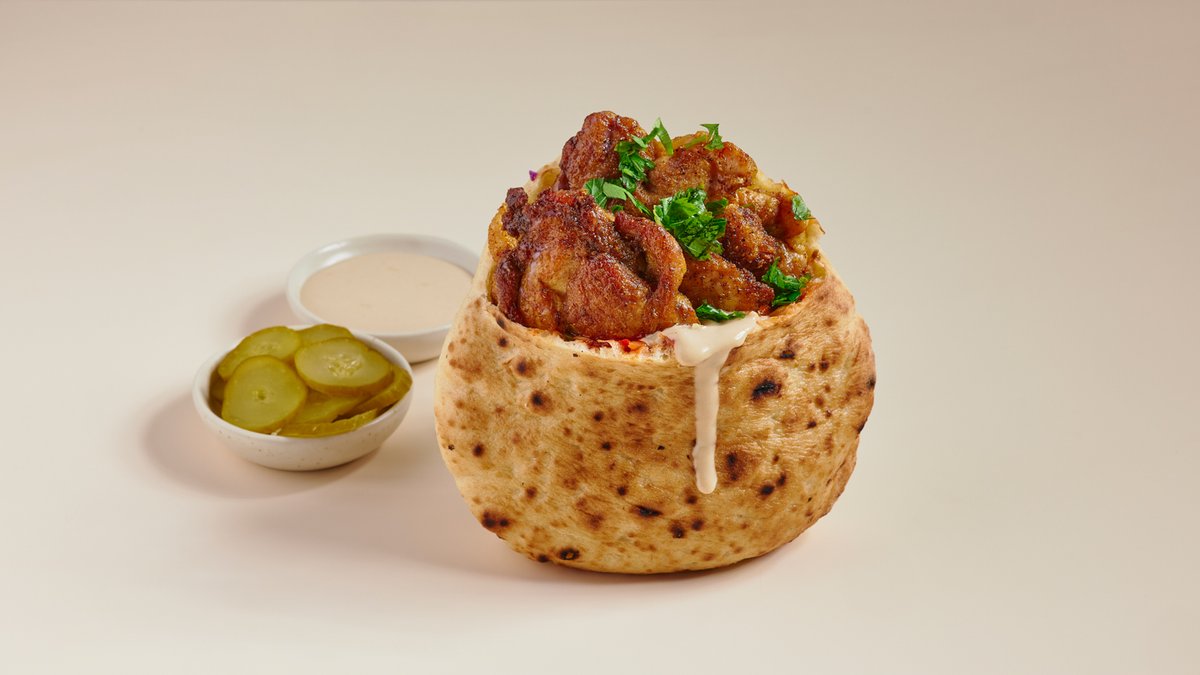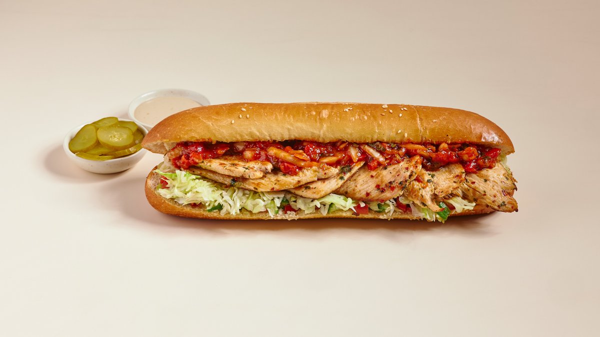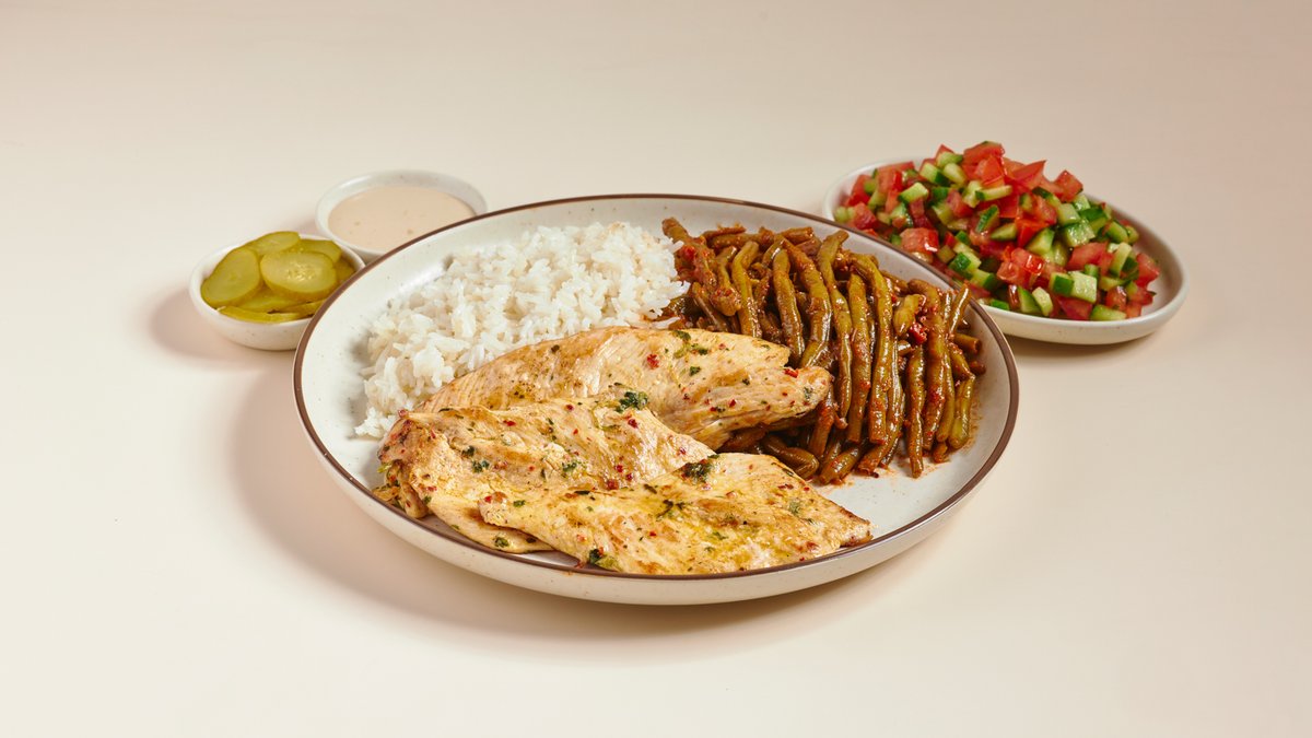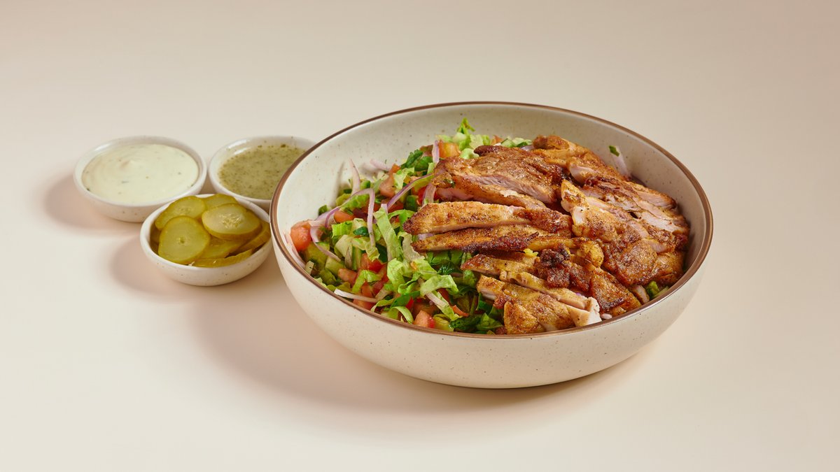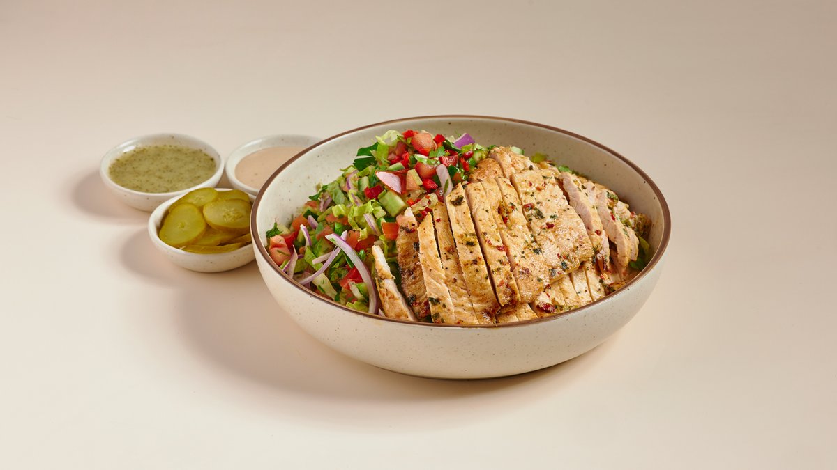 חזה עוף, מלפפון, עגבניה, תערובת ירוקים, בצל סגול ומעט פלפל חריף