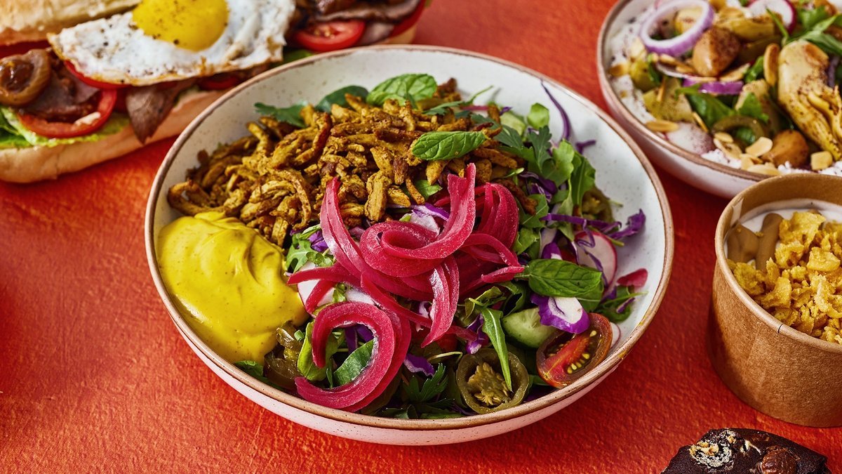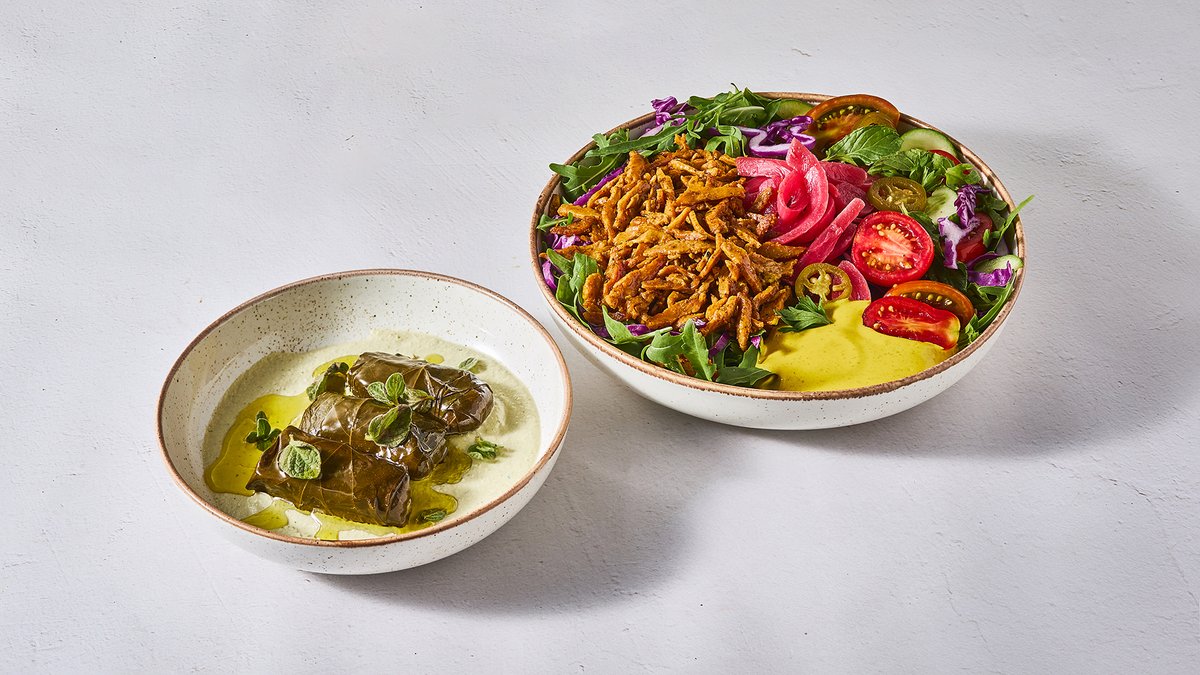 נתחי ווגי ציקן על הפלאנצ׳ה עם בצל מטוגן, שרי, מלפפון, צנונית, בצל מוחמץ, פטרוזיליה, נענע, רוקט, כרוב סגול, ברוטב שמן זית לימון ומעל כל זה טחינעמבה וחלפיניו (מכיל חלבון סויה)
