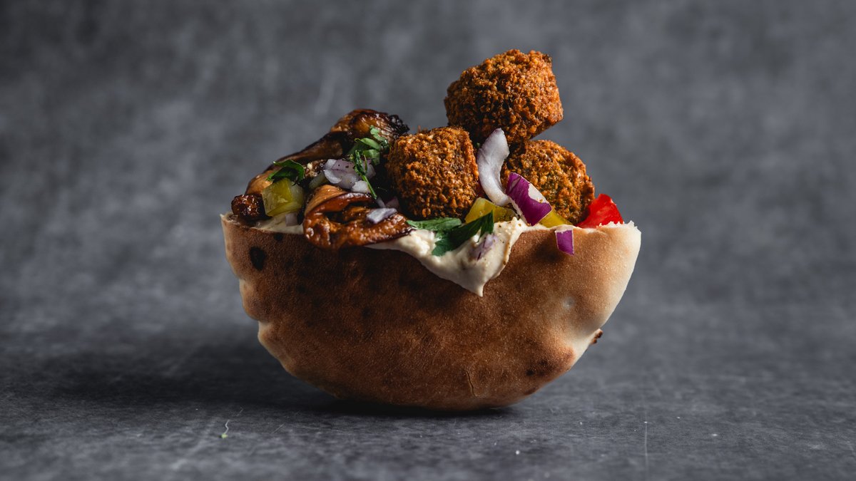 המנות מוגשות בפיתה עם סלטים וממרחים לבחירה 🥙