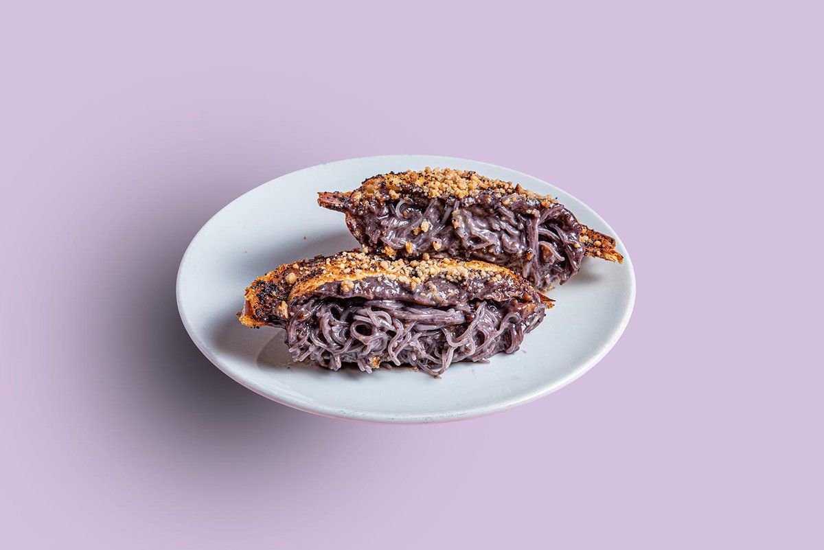 ספודו במילוי חלווה, אוכמניות ואטריות שעועית מצופה באגוזים מסוכרים