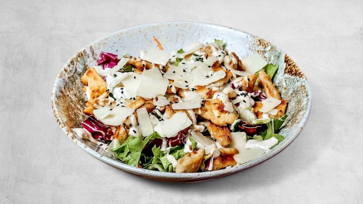 Hrskavi pileći odrezak u panko mrvicama poslužen na svježoj mješavini sezonske salate, obogaćen listićima Grana Padano sira i preliven našim domaćim bijelim umakom. Savršen spoj svježine i kremaste teksture, uz neodoljivu hrskavost zlatno pečene piletine.