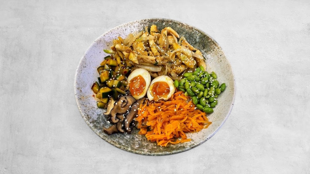 Japanska verzija zdjele – trakice sočno grillane piletine u yaki tare umaku, soja-marinirano jaje, shiitake gljive, pikantni svježi krastavci, svježa mrkva i edamame, posluženo preko mirisne jasmin riže.
