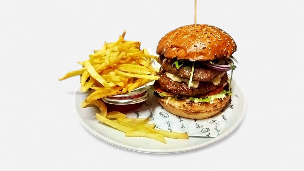 100% mlado meso bika (160 g), ketchup, majoneza, sezonska salata, kiseli krastavci, sir, rajčica, hrskavi luk, domaće brioche pecivo i domaći pommes frites *slika je simbolična