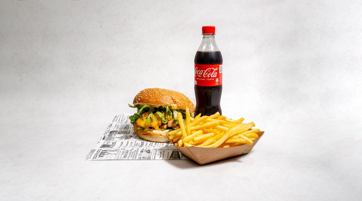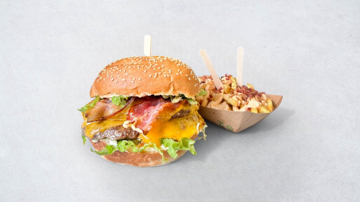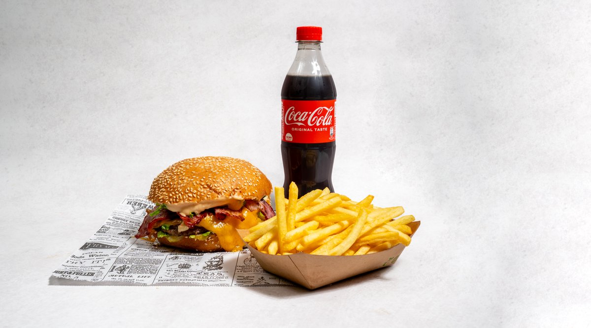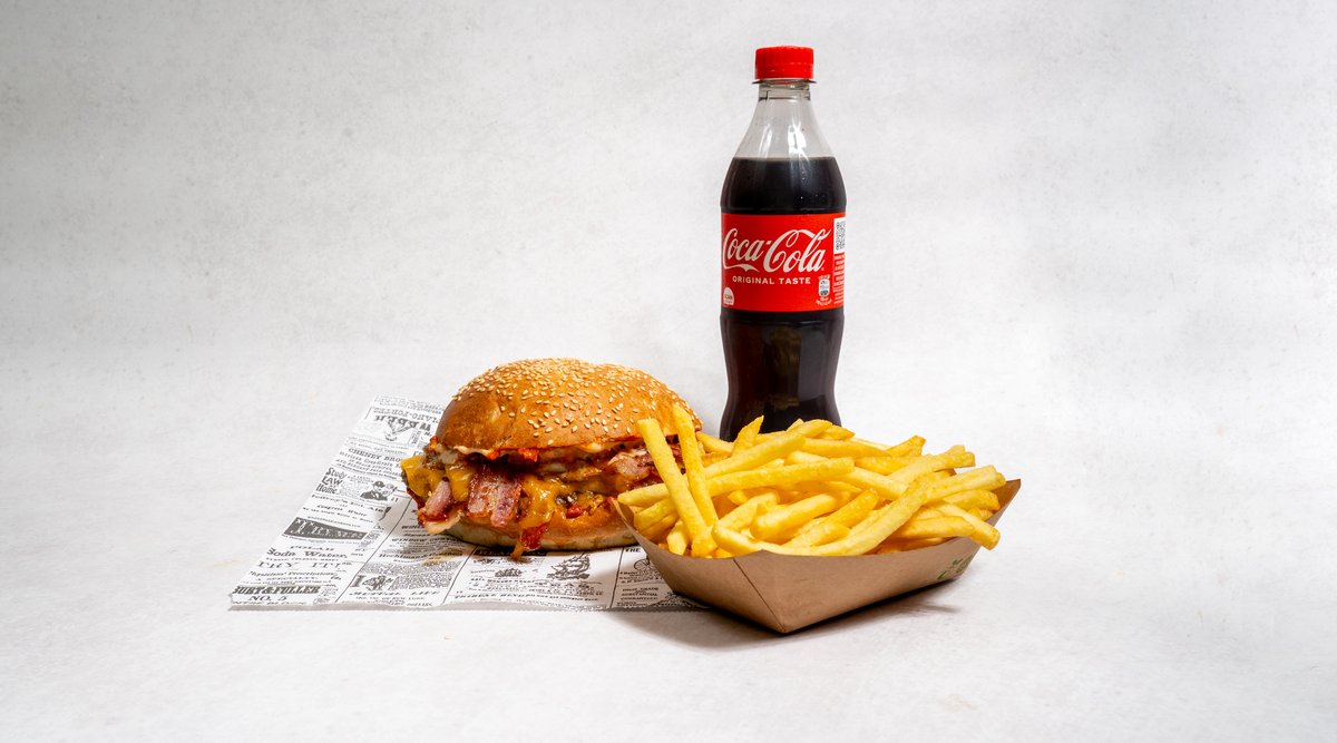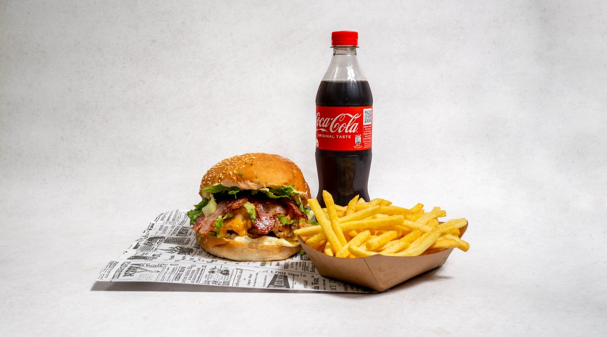 Beef pljeskavica (2x 200g), cheddar sir, bacon, majoneza, heavenly umak, salata, krastavci, pommes frites, piće po izboru *slika je simbolična