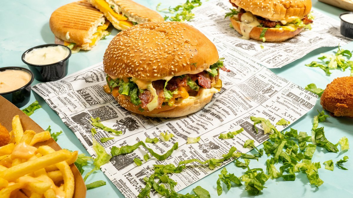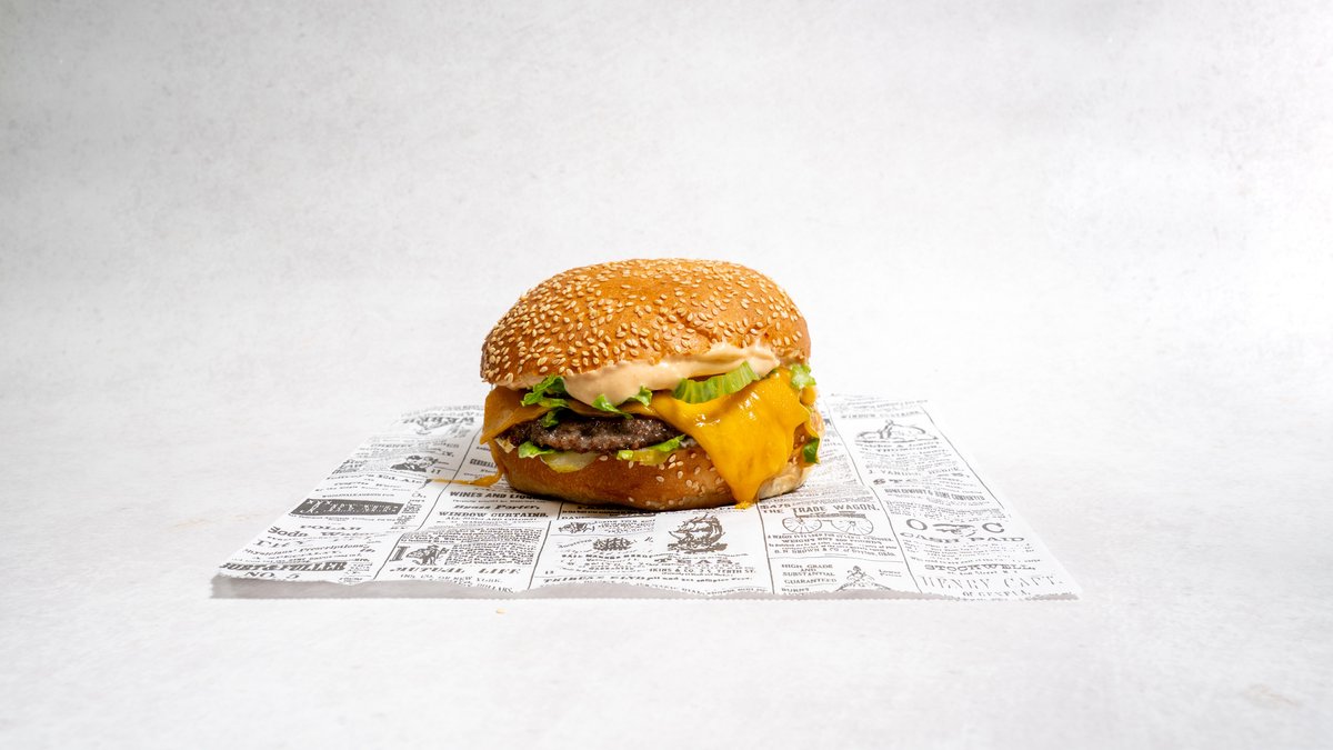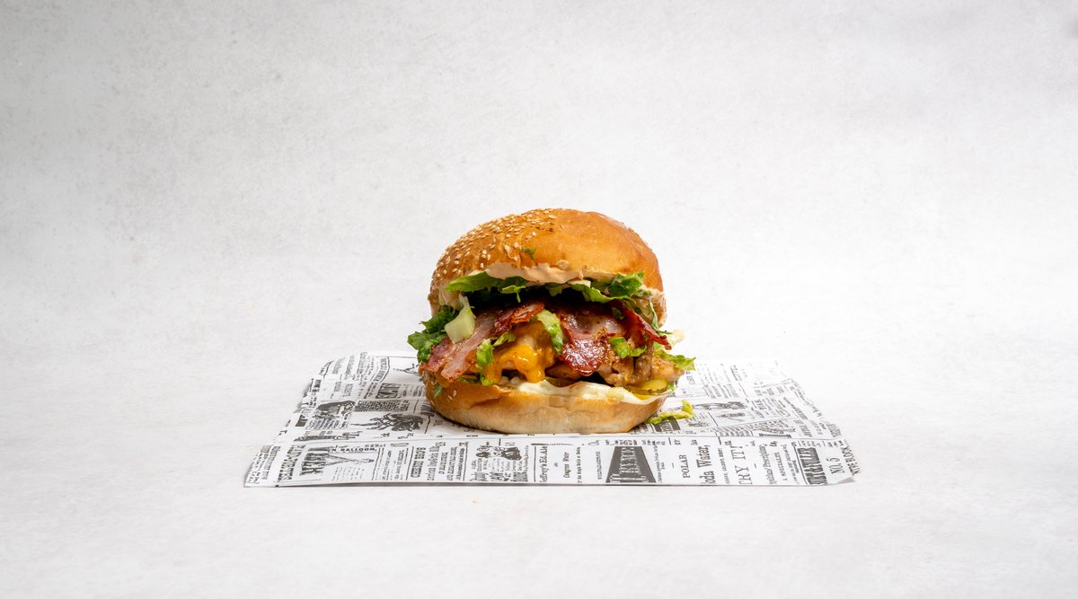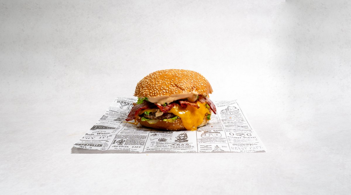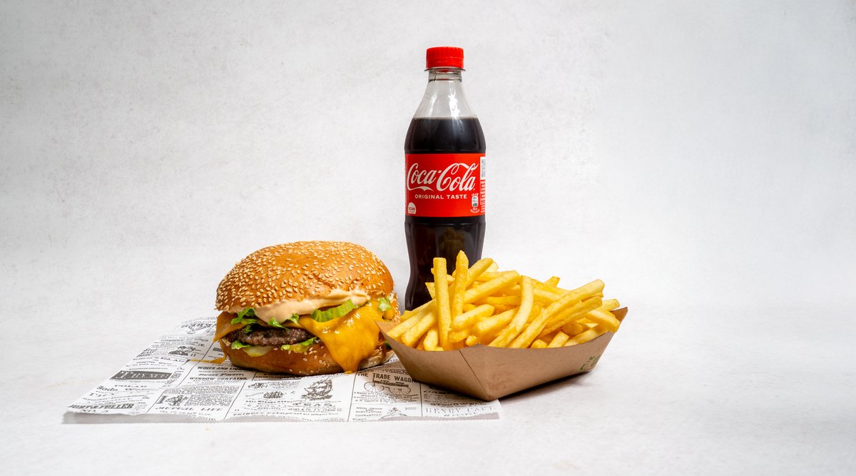 Beef pljeskavica (2x 200g), cheddar sir, bacon, majoneza, heavenly umak, salata, krastavci, pommes frites, piće po izboru *slika je simbolična