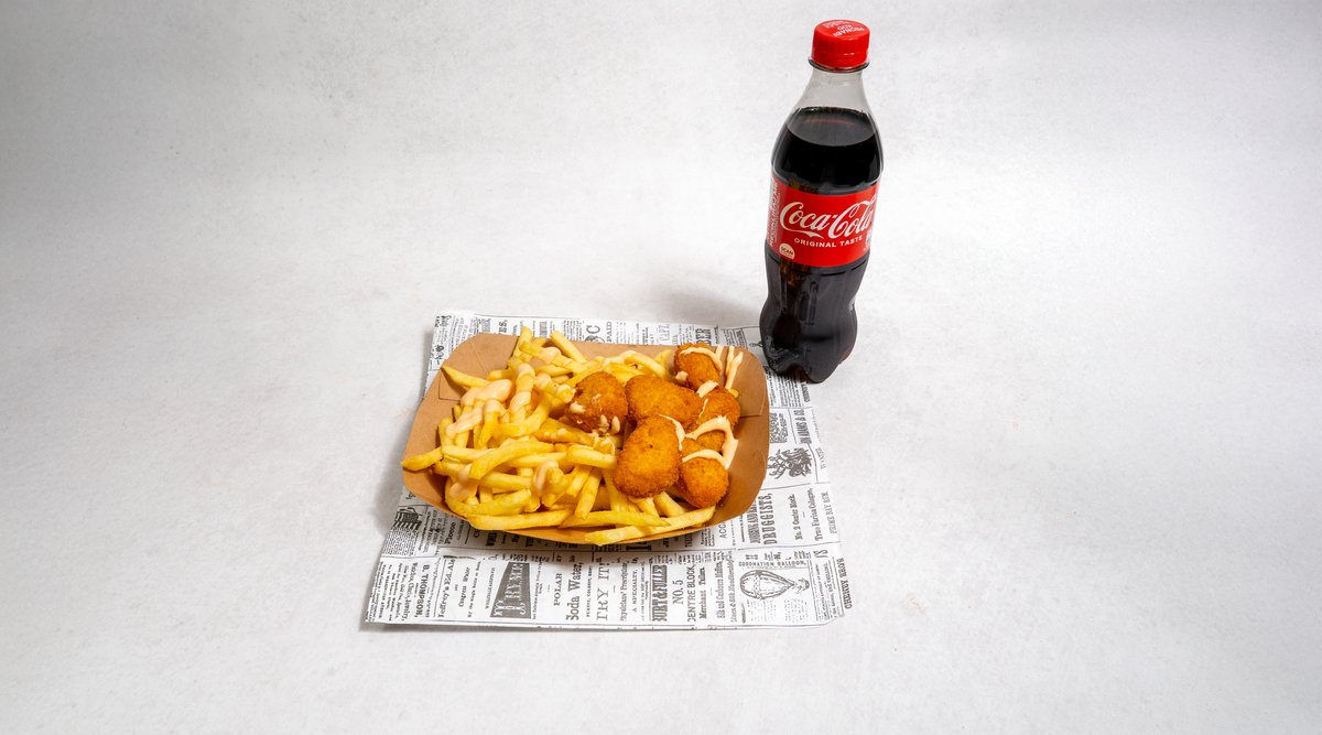Chicken nuggets, pommes frites, piće po izboru, umak