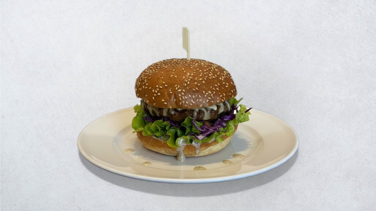 Pljeskavica, zelena salata, ljubičasti kupus, karamelizirani luk, tartuf umak