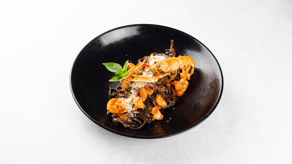 Ravioli od sipinog crnila punjeni sirom, umak od kozica *slika je simbolična
