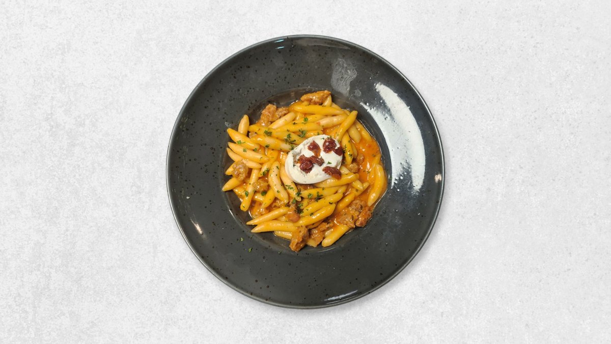 Pljukanci s pestom od burrate, cherry rajčice i suhe rajčice, meso istarske kobasice