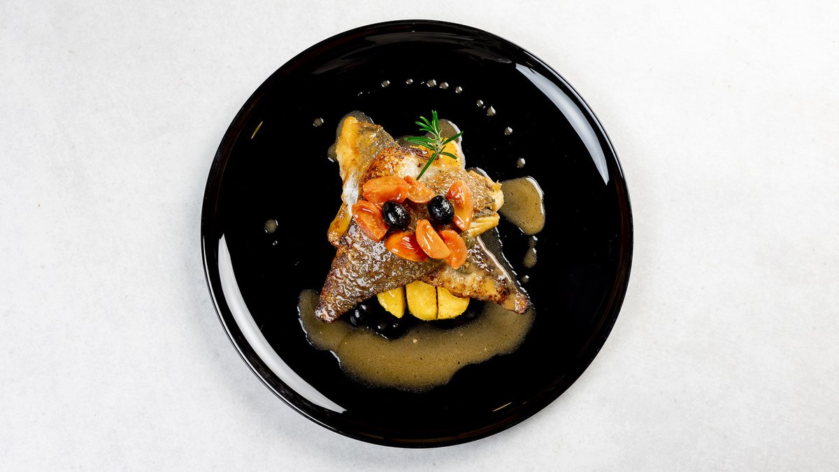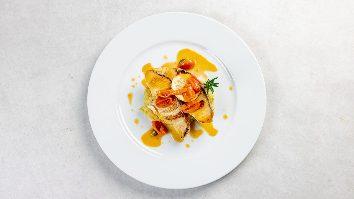 File orade sa žara u umaku od bijelog vina s kaparima, maslinama i cherry rajčicama uz palentu