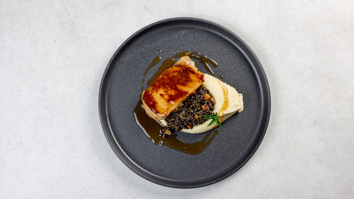 Svinjski kotlet u bogatom mesnom umaku uz pire od krumpira i ragu od leće