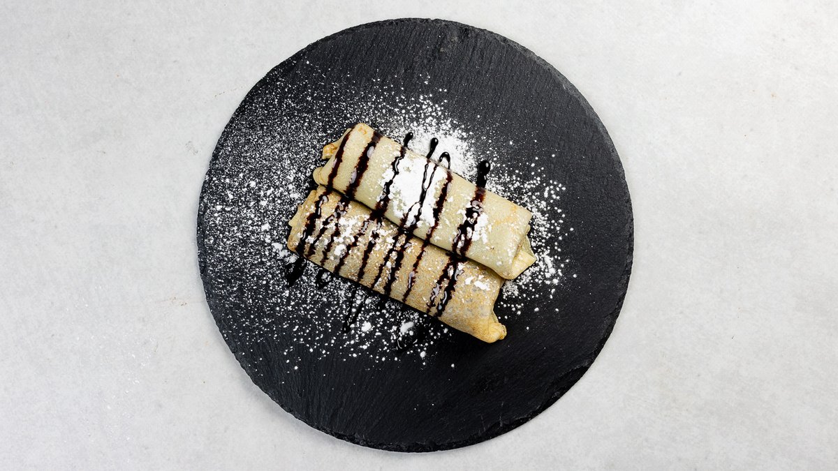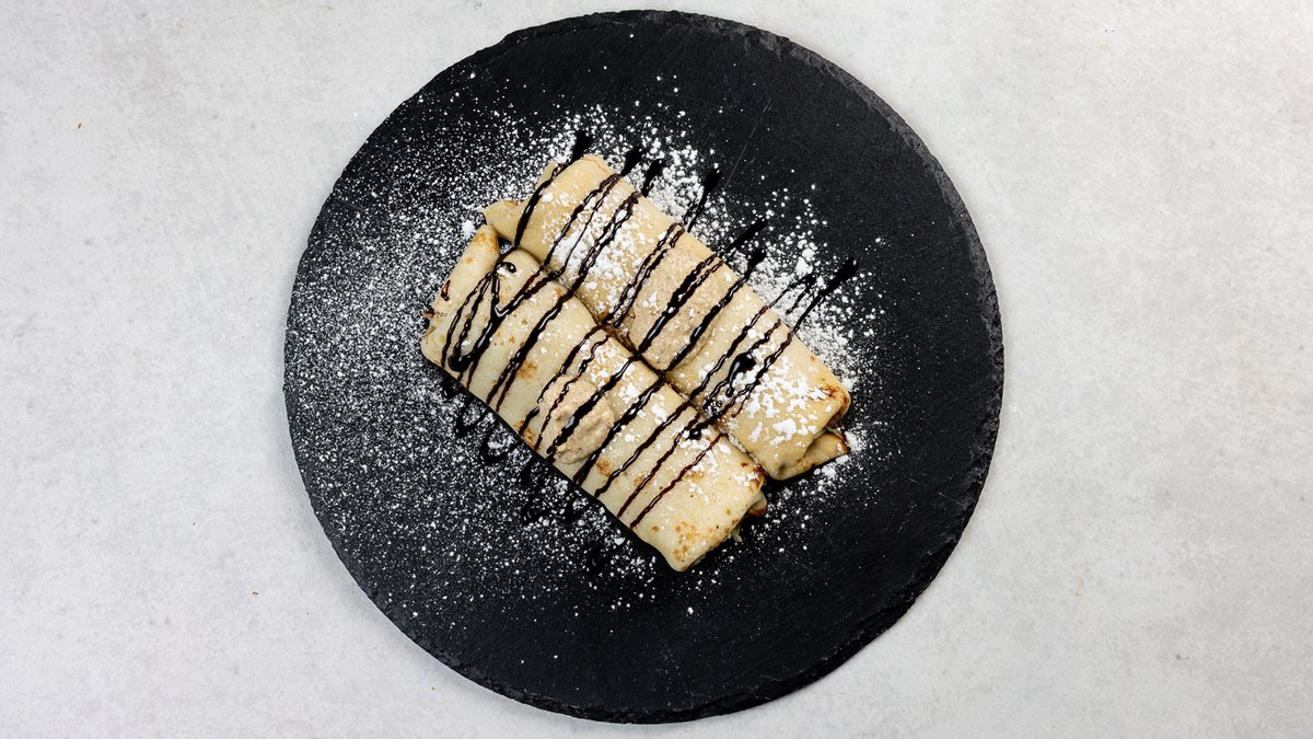Dvije slasne palačinke punjene kremom od mljevenih oraha uz preljev od čokolade