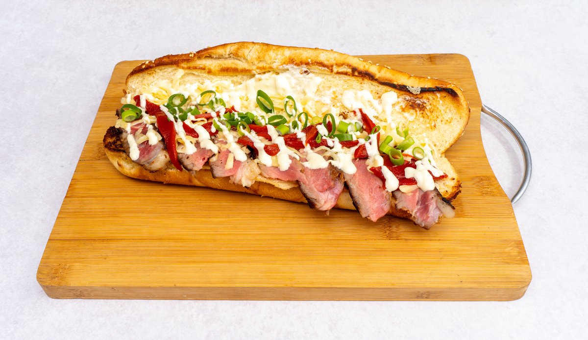 Brioche pecivo, gouda, mozzarella, crvena pečena paprika, mladi luk, tzatziki umak, kajmak, meso po izboru
