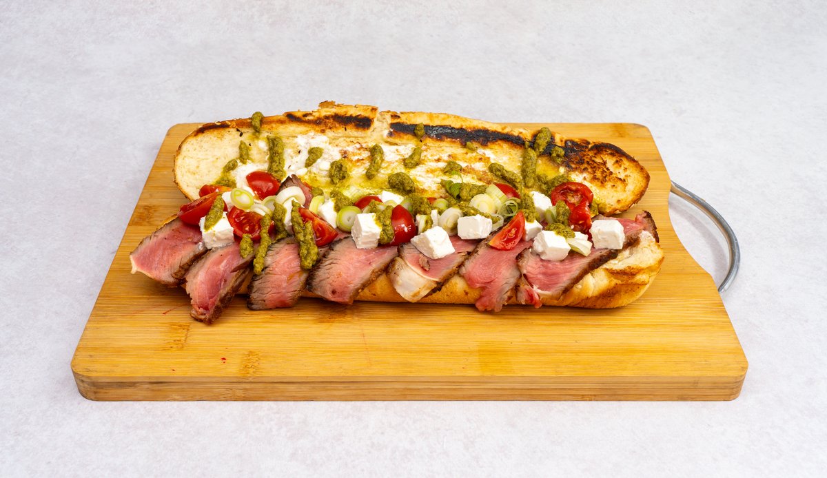 Brioche pecivo, mozzarella, feta sir, pesto Genovese, cherry rajčica, mladi luk, umak majoneza-češnjak, kajmak, meso po izboru