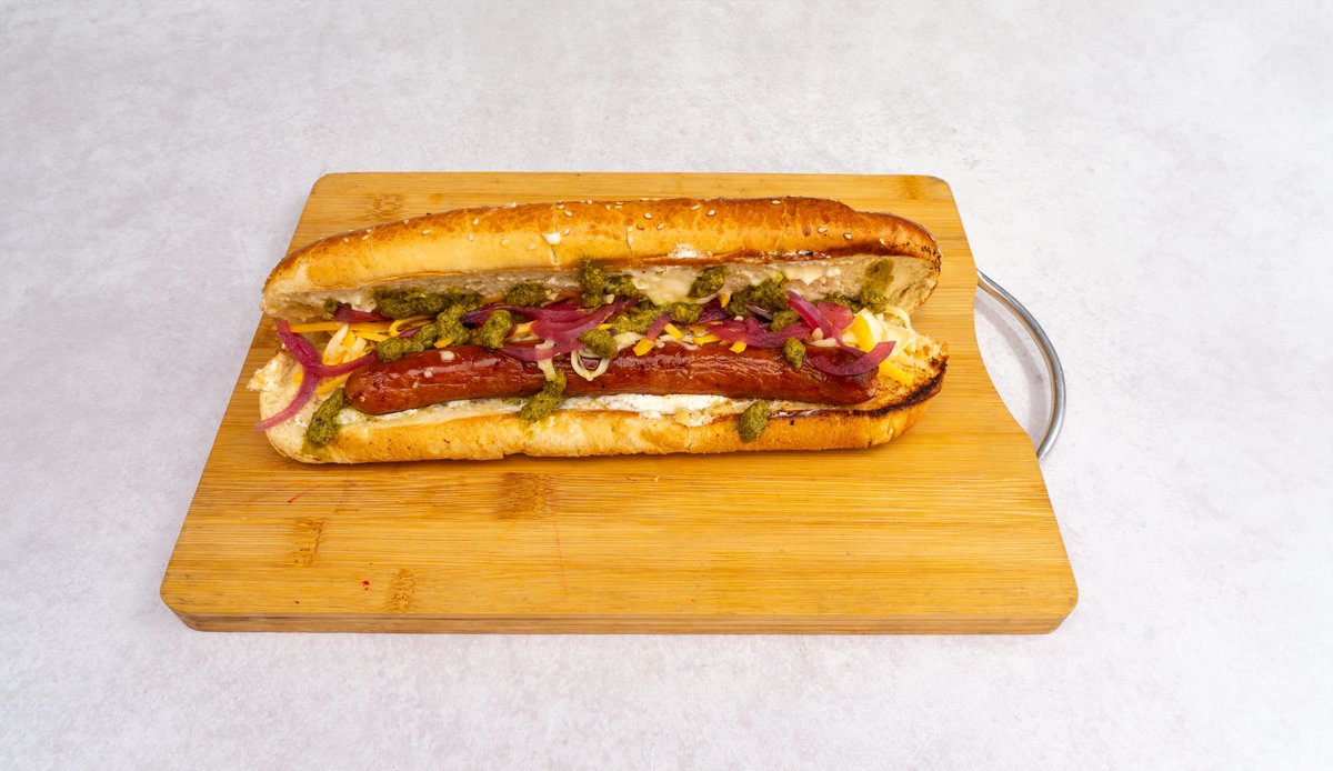 Domaće brioche pecivo, kobasica, pesto genovese, ukiseljeni luk, cheddar, gouda, tzatziki umak, domaći kajmak