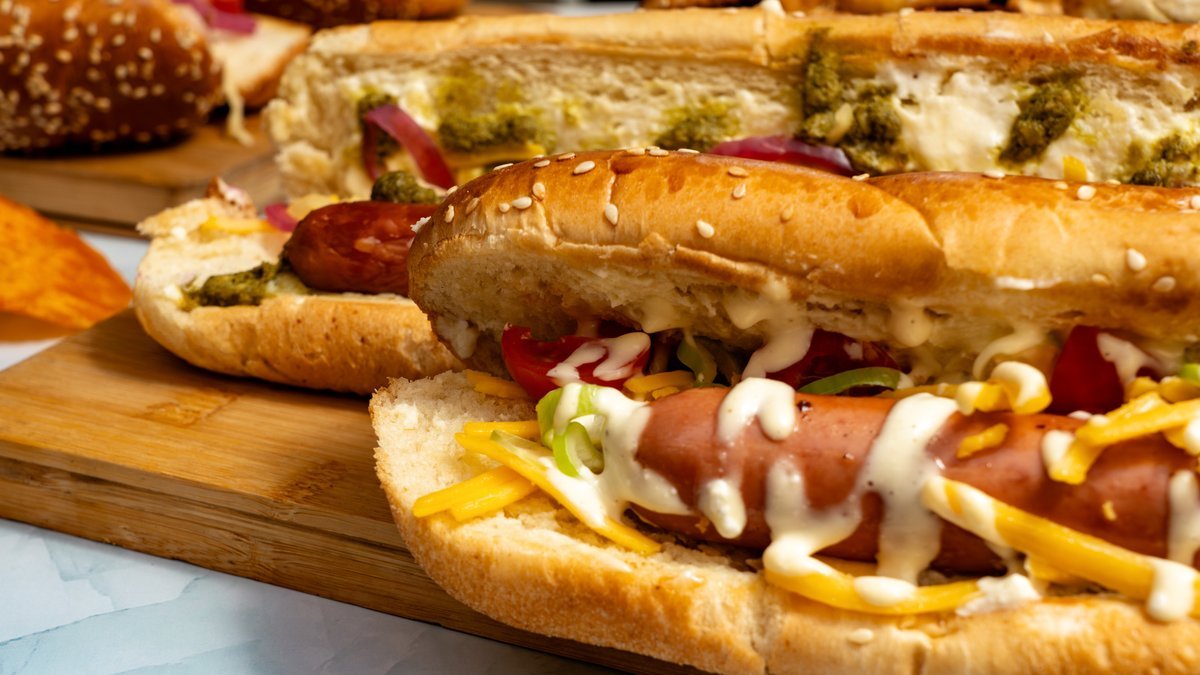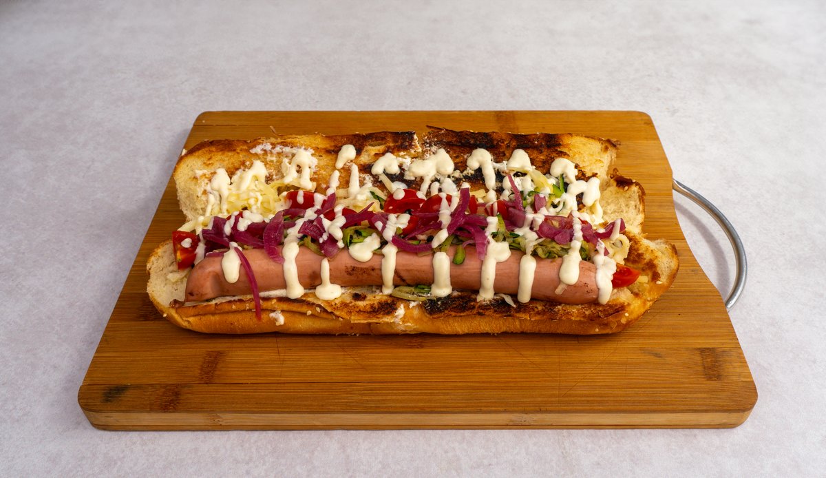 Domaće brioche pecivo, kobasica, crvena pečena paprika, ukiseljeni luk, cheddar, gouda, mozzarella, slanina, umak senf-med