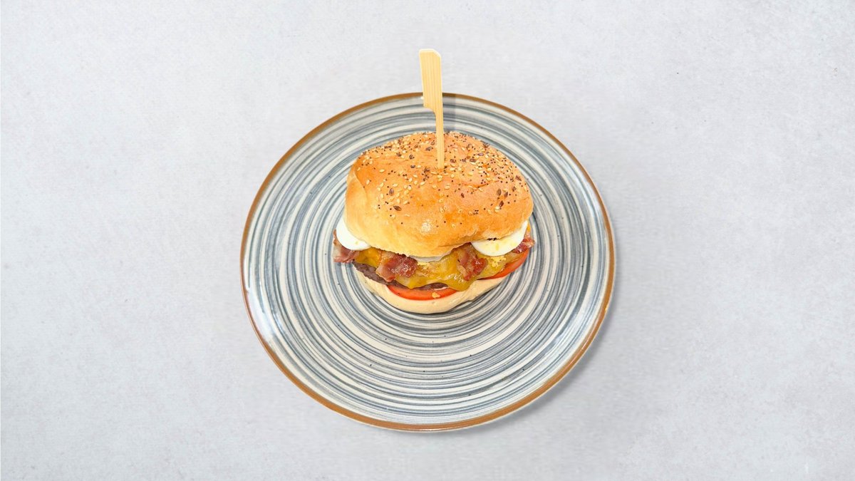Domaće pecivo, meso po izboru, domaća kuhana jaja, hrskava slanina, cheddar-mozzarella, rajčica, umak mayo-senf