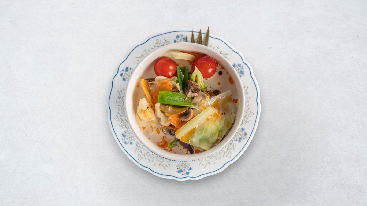 Obročna juha od povrća; mrkva, kupus, brokula, karfiol, galangal, lišće kvgave limete, limunska trava, šampinjoni, cherry rajčica, chalote luk, mladi luk, kokosovo mlijeko, sok limete, domaći chili džem
