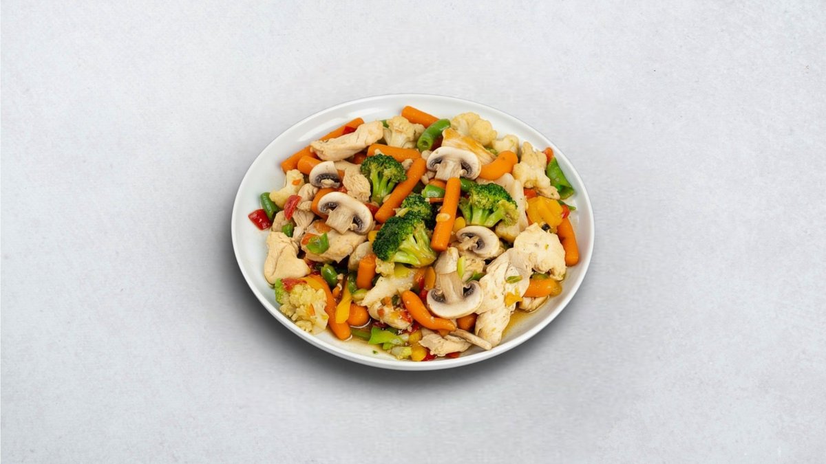 Miješano povrće s umakom od kamenica; kupus, mrkva, šampinjoni, karfiol, brokula, crveni kupus, rajčica, češnjak, umak od kamenica, umak od soje *slika je simbolična