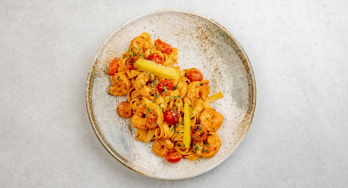 Domaća tjestenina, kozice, pesto rosso, cherry rajčica, češnjak, peršin, pepperoncino