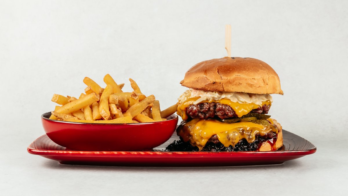 Pecivo, 2x juneće meso, marmelada od kapule, cheddar, kiseli krastavci, BBQ umak, coleslaw salata, Mccain pommes frites