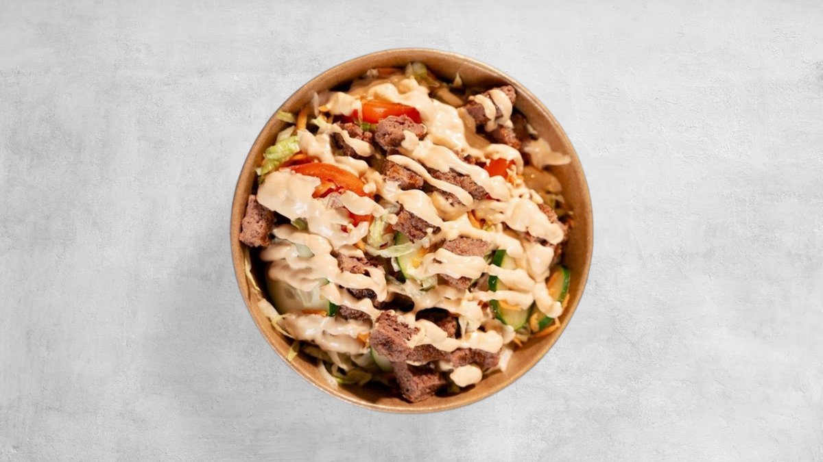 Iceberg salata, rajčica, krastavci, mrkva, pljeskavica, dresing