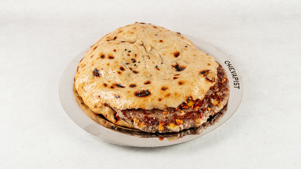 Fina pljeskavica od junećeg mesa sa sirom, pepperoncinom, pancetom, ljutikom i češnjakom (250g) u travničkoj lepinji
