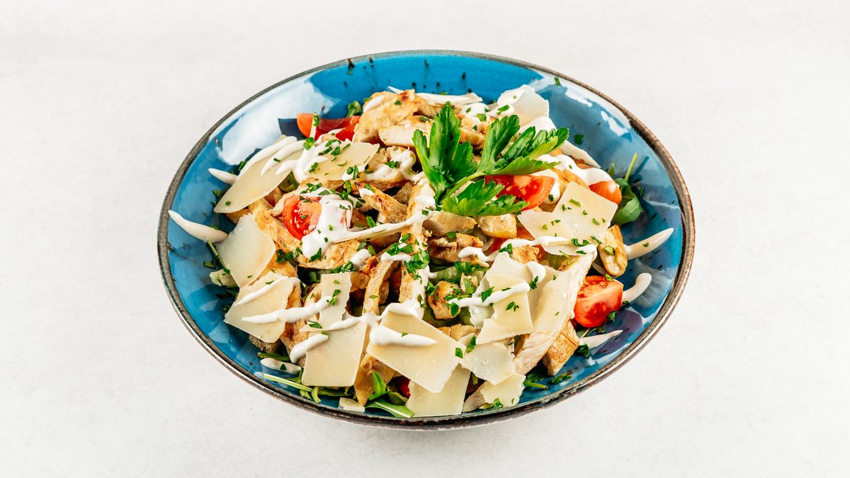 Hrskava svježa salata s rikulom, cherry rajčicama i krutonima, prekrivena grana padanom i piletinom u caesar umaku, GMO FREE