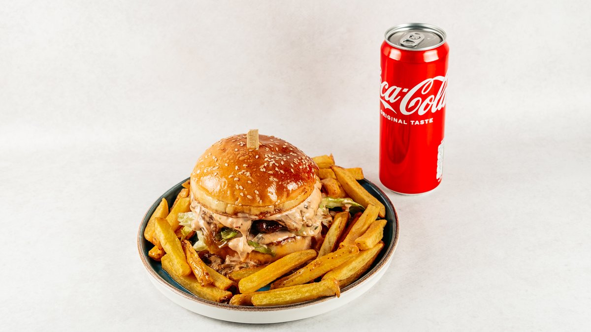Sočni burger od 100% junećeg mesa iz domaćeg uzgoja s parmezanom, cheddarom, zelenom salatom, burger umakom i umakom od karamelizirane ljutike, homemade brioche pecivo, domaći prženi krumpirići, piće po izboru