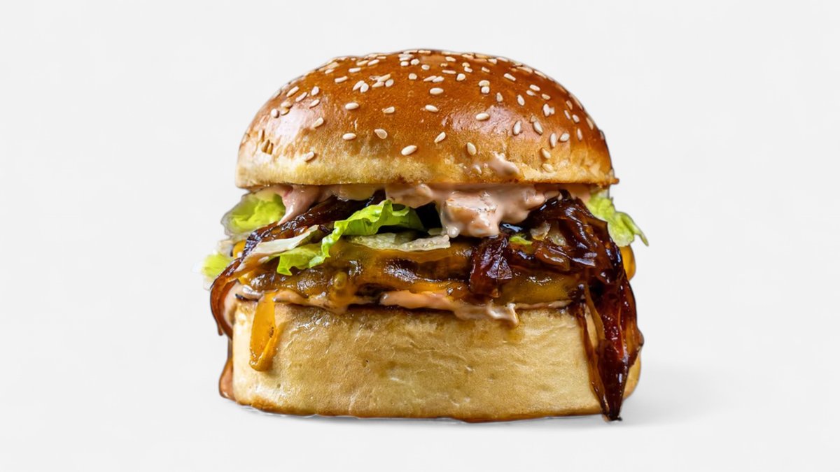 Sočni burger od 100% junećeg mesa iz domaćeg uzgoja s parmezanom, cheddarom, zelenom salatom, burger umakom i umakom od karamelizirane ljutike, homemade brioche pecivo
