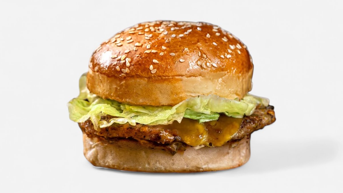 Sočna pljeskavica od otkoštenih pilećih bataka s pistacijom, cheddarom, zelenom salatom, kremastim umakom s dodatkom limete, homemade brioche pecivo, GMO FREE