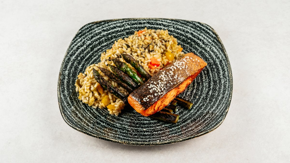 Filet lososa, rižoto od bosiljka, šparoge sa žara *slika je simbolična