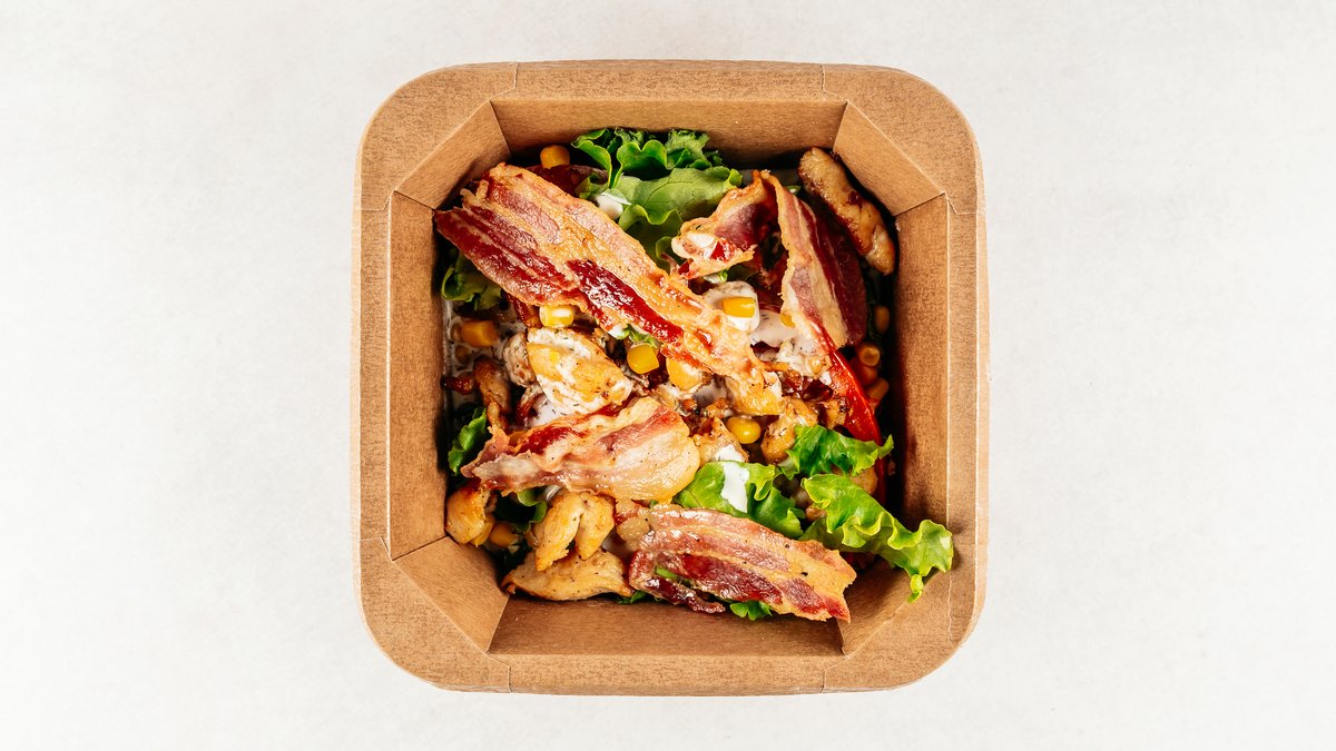 Sočna piletina i sir preko svježe salate s rajčicom i kukuruzom, uz blagi umak, hrskavu pancetu i zlatne kockice tosta