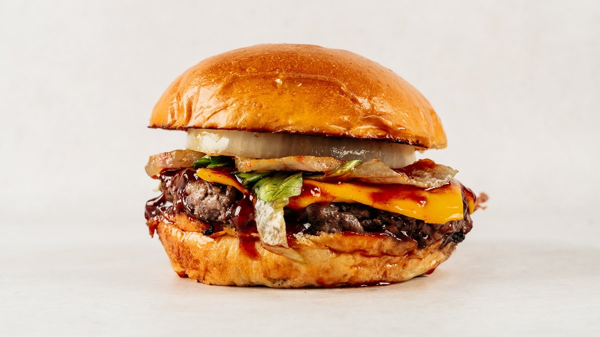 Dvije 100% juneće pljeskavice s topljenim sirom, hrskavom pancetom, svježom salatom i BBQ umakom na tostiranim bublicama s karameliziranom kapulom