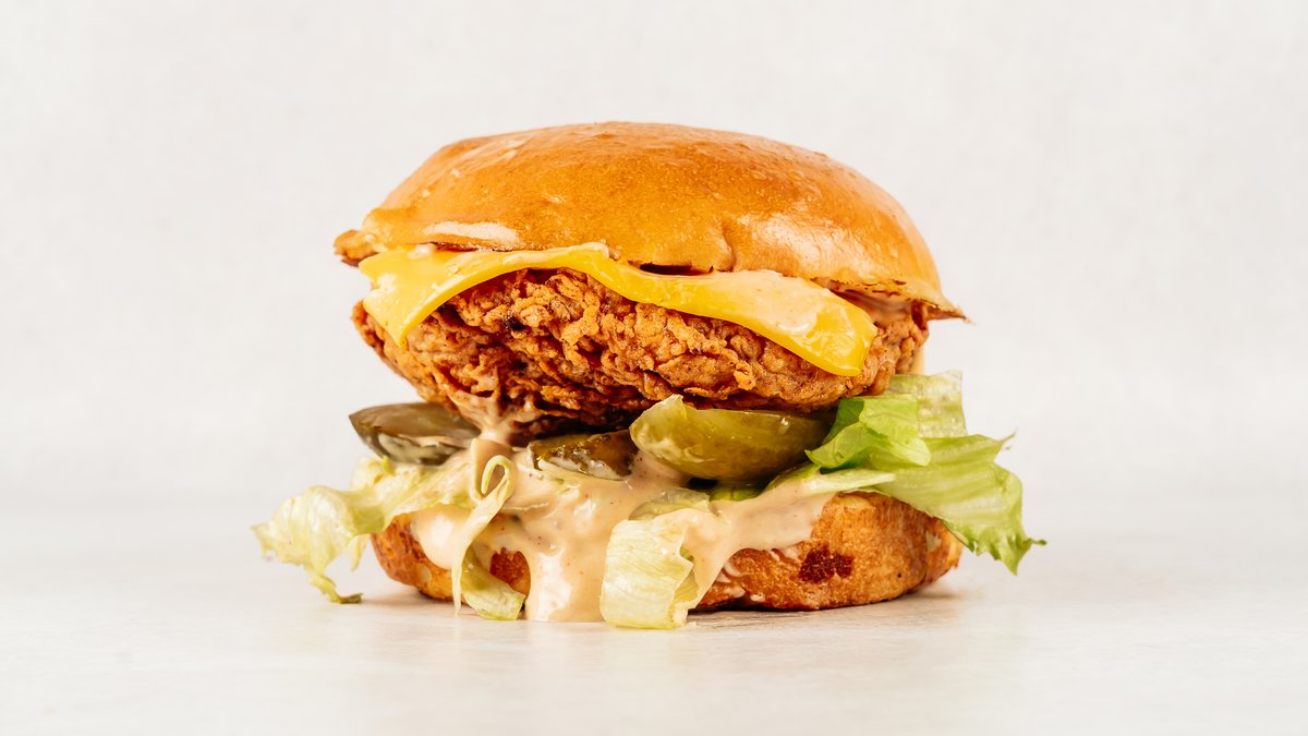 Extra hrskava začinjena piletina u tostiranoj bublici s Champ umakom, topljenim sirom, svježom salatom i kiselim krastavcima