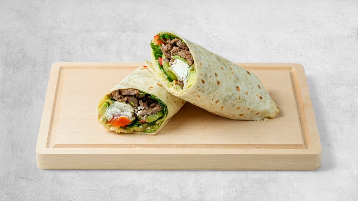 653 kcal Ramsteak, bijeli sir, humus, tortilja, iceberg salata, rikola, kiseli krastavci, avokado, krastavac, paprika, cherry rajčica, fresh hladna tortilla