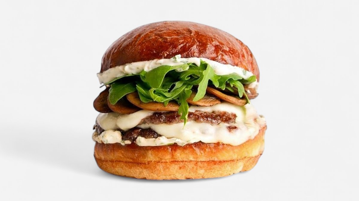 Dvije juneće pljeskavice (120g), ementaler sir, gljive, rikula, chimichurri mayo