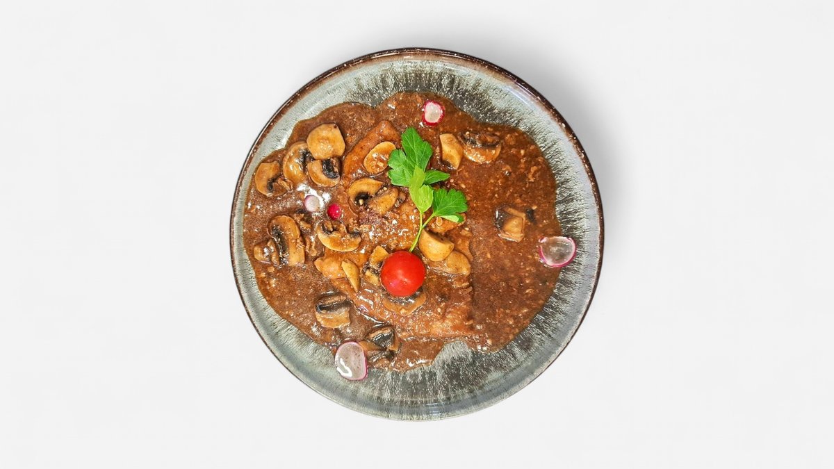 Pohani pileći file prekriven šampinjonima i sirom zapečen u krušnoj peći, pommes frites