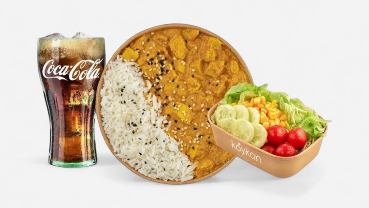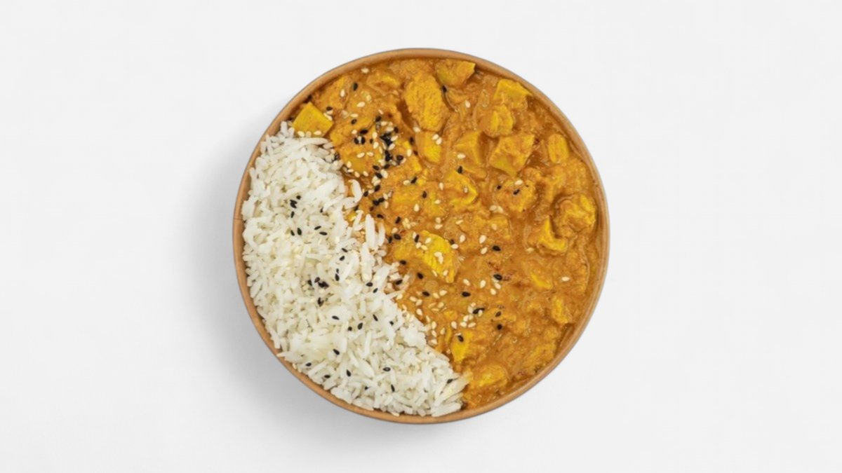 100% pileća prsa poslužena s curry kokosovim umakom, basmati rižom i pečenim sezamom.