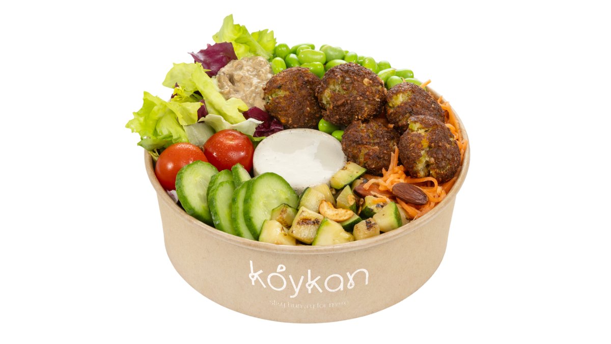 Miješana salata, Falafel kuglice, Italian dressing, Ukiseljena mrkva, Edamame, Cherry rajčice, Krastavac, Tikvice sa žara, Mješavina prženih orašastih plodova i Tahini umak