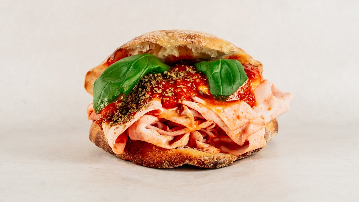 Mortadela, domaća šalša s grilanim cherry rajčicama, mozzarella fior di latte, sušeni origano, svježi bosiljak