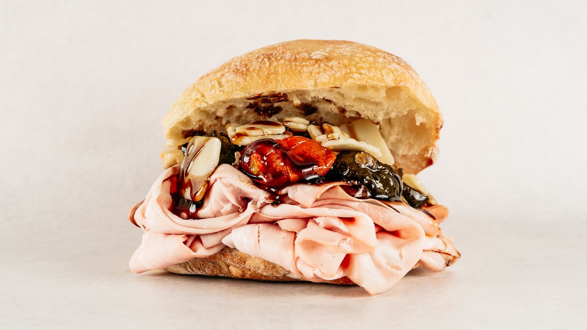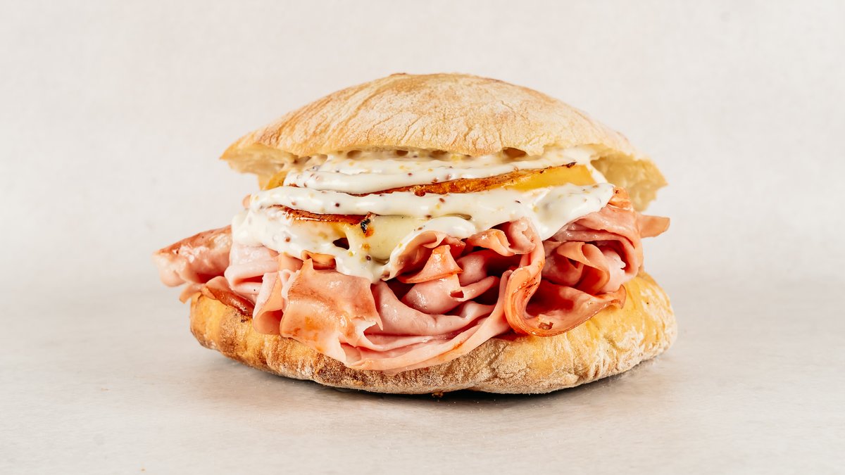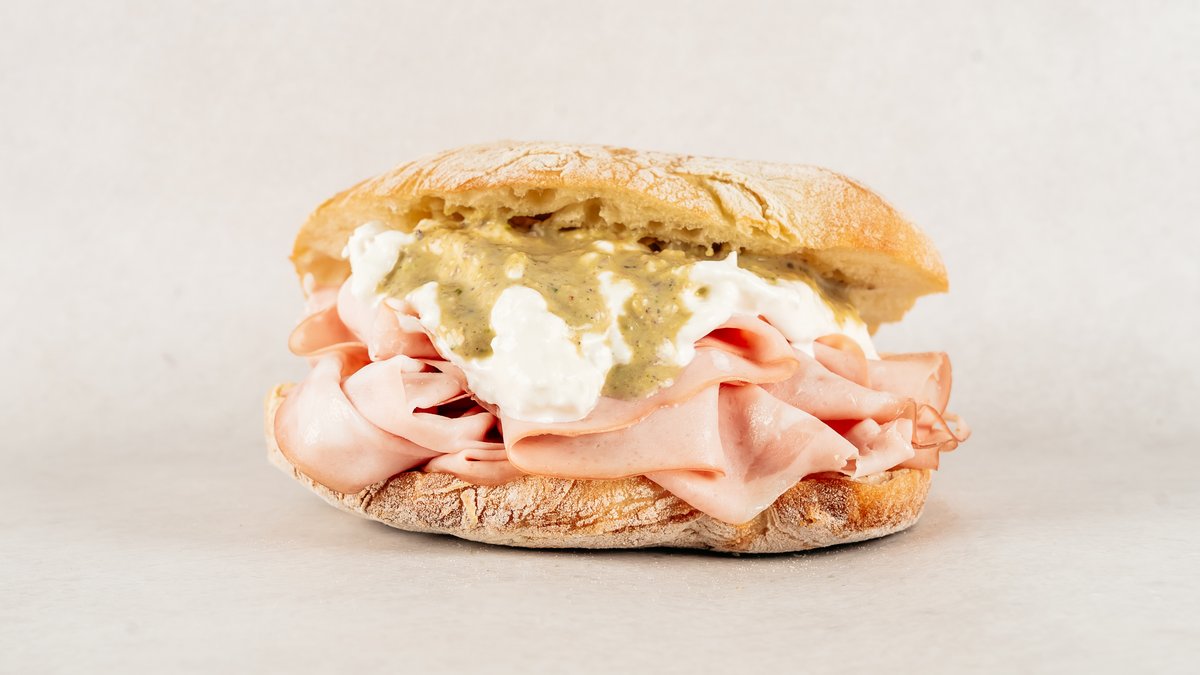 Grilana mortadela, grilana provola (dimljena mozzarella), umak od majoneze i dijon senfa