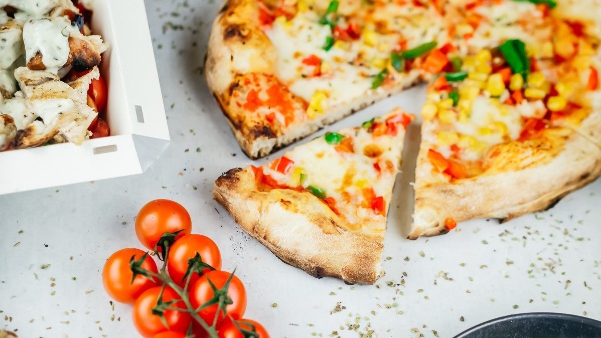 Tijesto, pasirana rajčica, mozzarella Fior di latte, panceta, šampinjoni, crveni luk, paprika, vrhnje