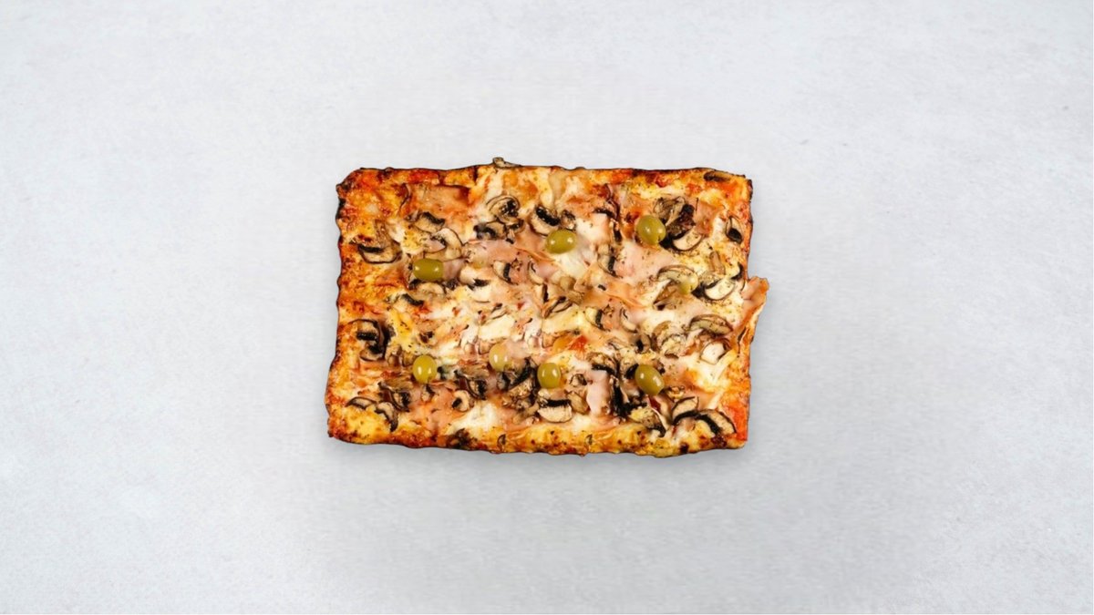 Pelati, edamer, gouda, kuhana šunka, svježi šampinjon, origano, maslina
