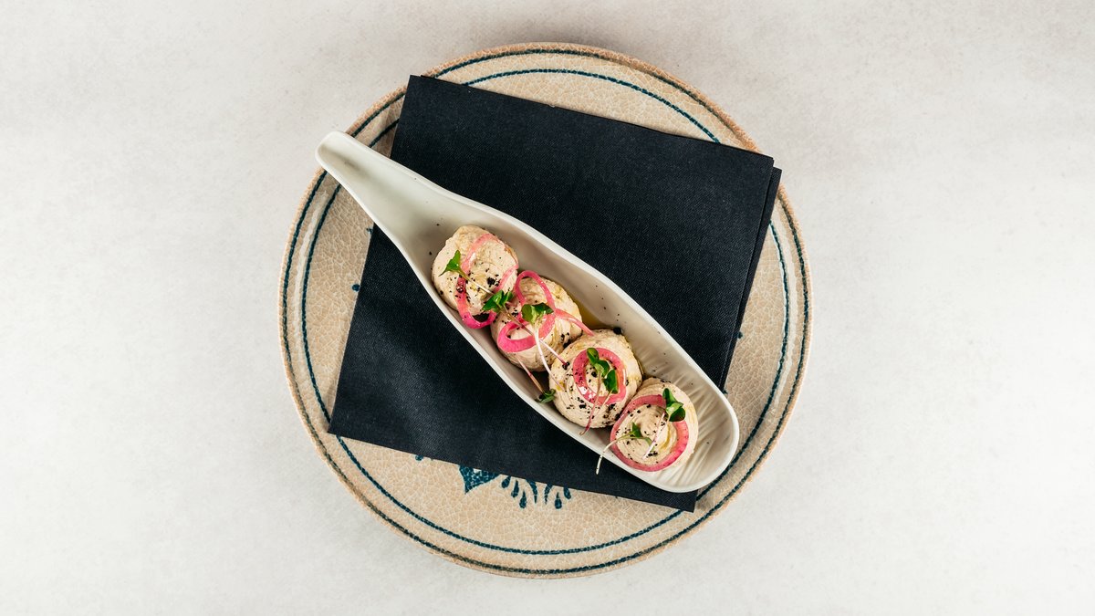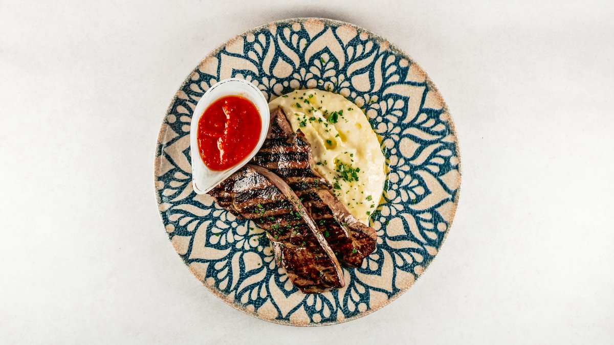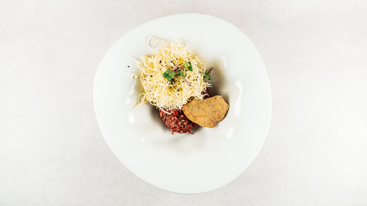 Juneće meso, kompot od poma, kreker od sezama, džem od kapara i limuna, krema od senfa, zapečeni kruh