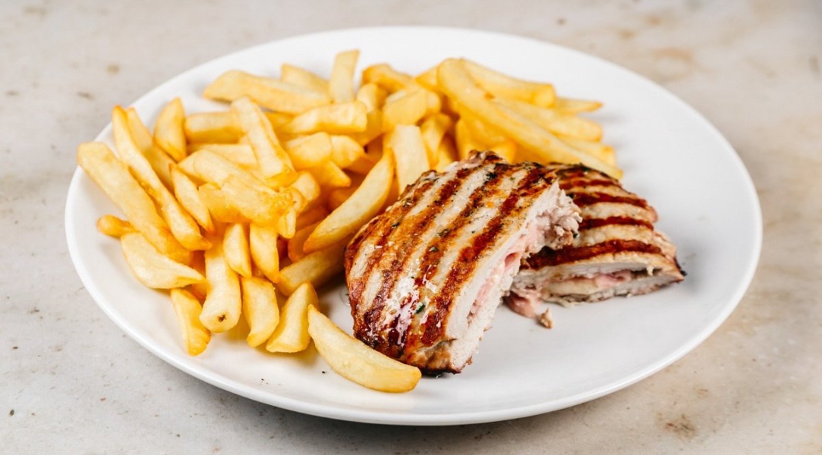 200 grama teletine, pomfrit,začini,češnjak,peršin