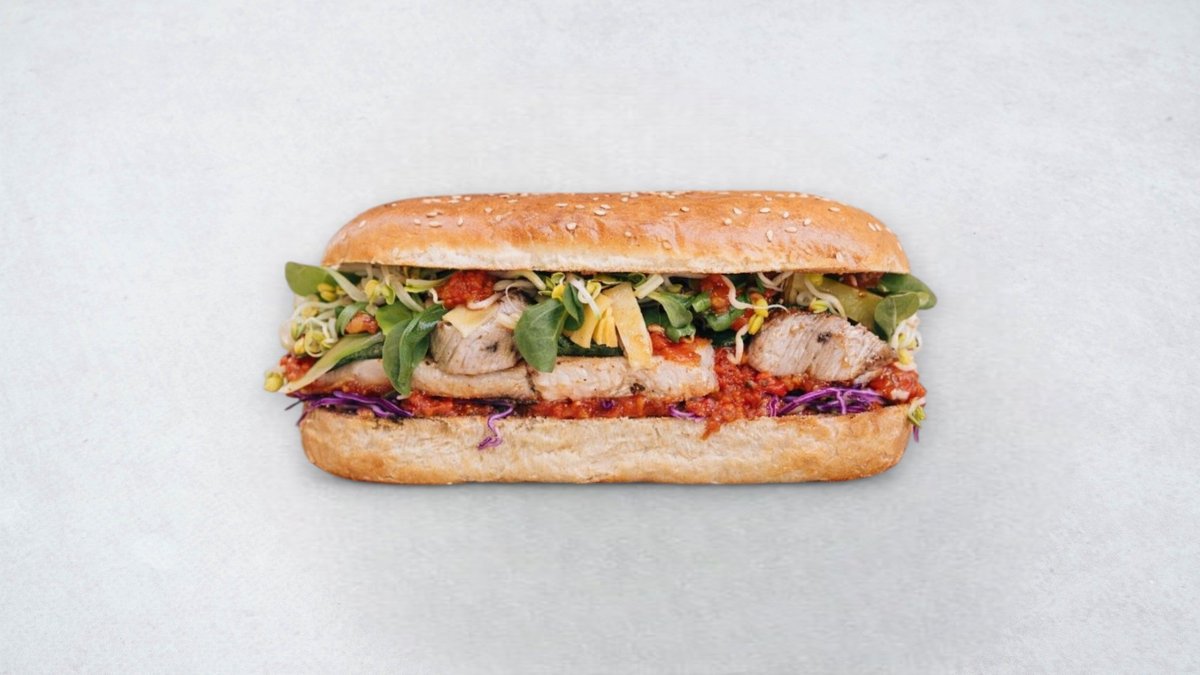 Bijelo hot dog pecivo, grilani odrezak tune, šalša, bijeli i creveni kupus, grilana tikvica, artičoka, matovilac, klice alfa alfa *slika je simbolična