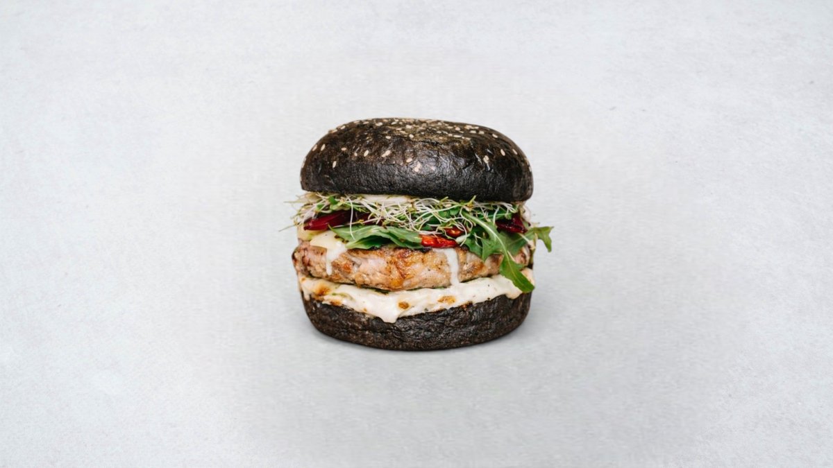 Crno burger pecivo, grilani odrezak tune, gorgonzola umak, iceberg salata, crispy luk, parmezan, sušena brusnica, rikula, klice, chili umak