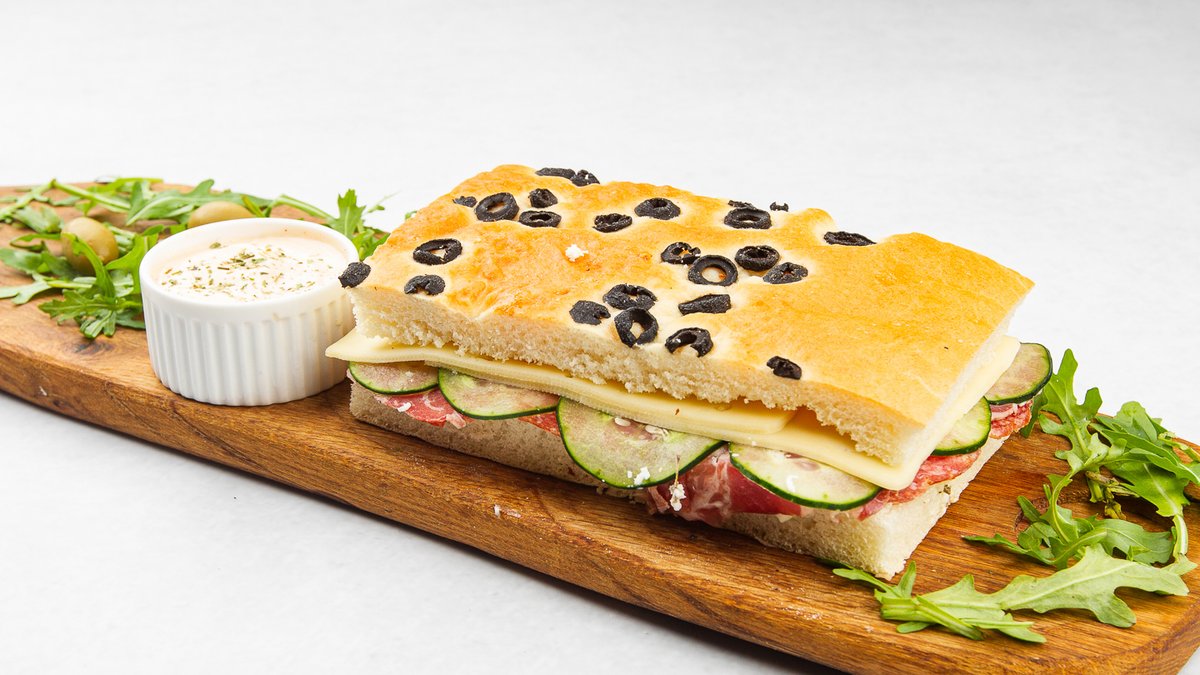 Tostirana focaccia, pršut, mozzarella, rikula, Grana Padano, cherry rajčice *slika je simbolična